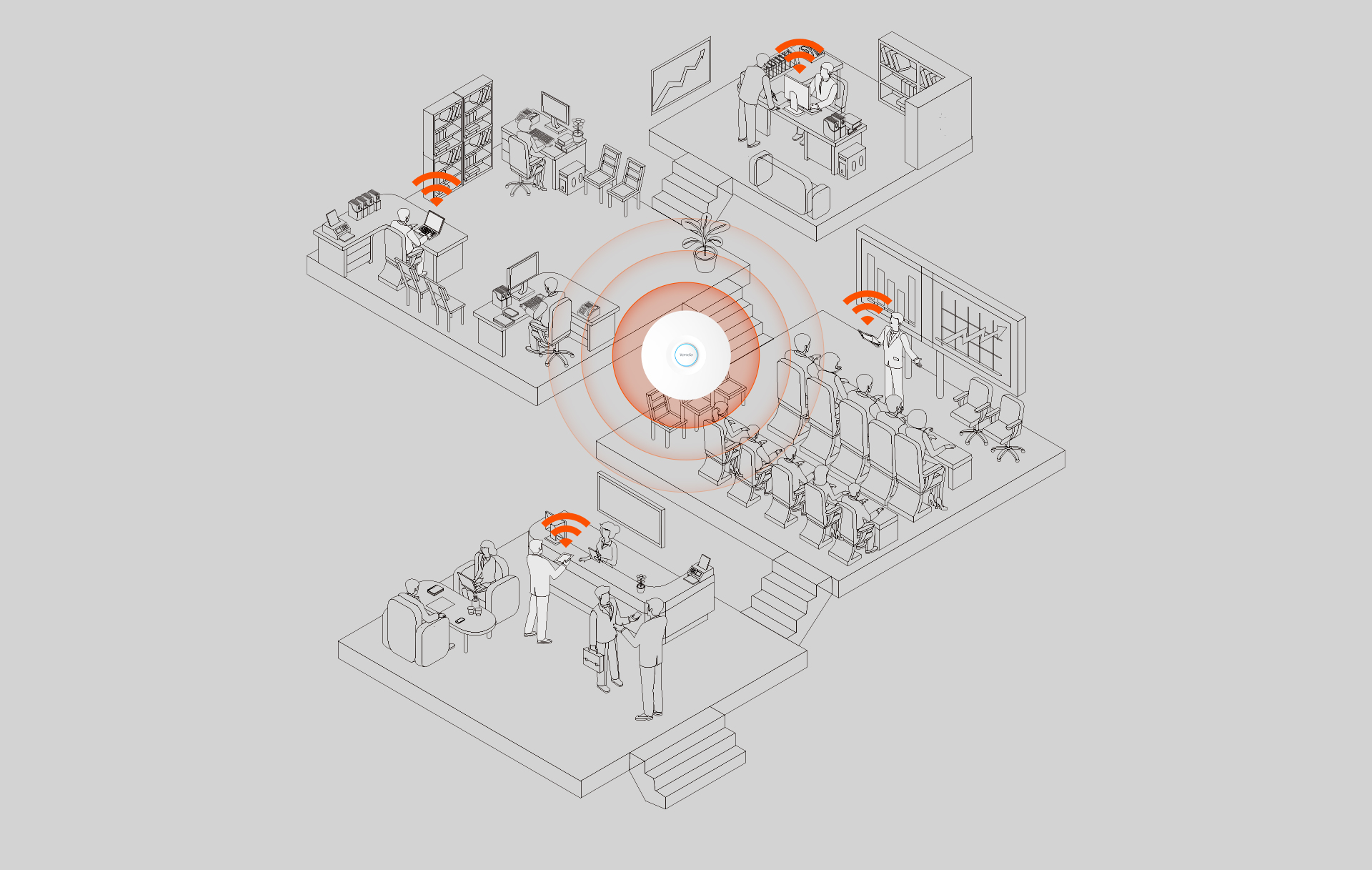 Designed for 4K Video conferencing with the new generation Wi-Fi 6 technology, I29 supports 160MHz bandwidth and dual-band concurrent wireless rate of up to 3000Mbps, enhance experience of 4K ultra-HD videoconferencing. 4 independent high-performance FEM provide wider coverage, stronger penetration, 500㎡ high-speed network coverage, OFDMA and MU-MIMO technologies greatly enhance the channel capacity, allowing for more efficient data transmission, reducing lag and providing access for 150 devices at the same time.